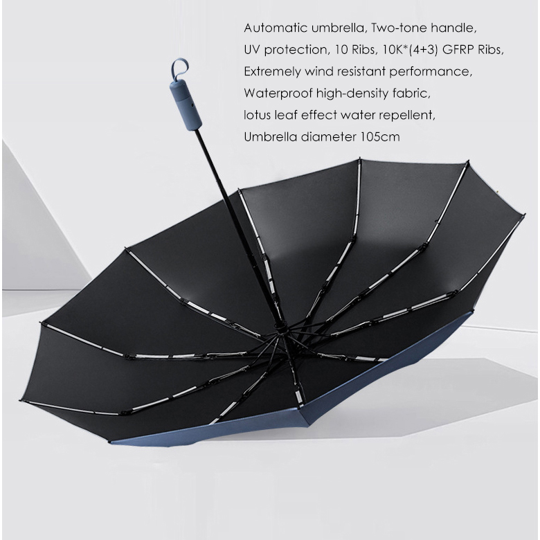 Automatic umbrella, Two-tone handle, UV protection, 10 Ribs, 10K*(4+3) GFRP Ribs, Extremely wind resistant performance, Waterproof high-density fabric, lotus leaf effect water repellent, Umbrella diameter 105cm
